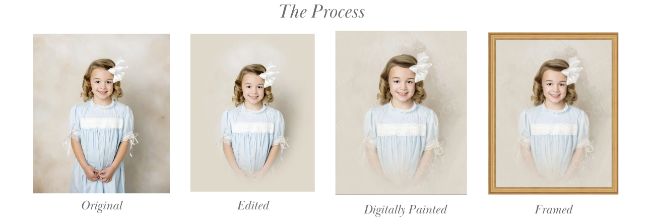 The beauty of an oil painting with the use of modern technology, these portraits are truly a keepsake to be cherished. The process begins with a fine art children’s session in the studio and then you will choose your favorite image to be hand edited. The edited image is then delicately and each pixel is digitally painted. Once complete, the image is printed on fine art canvas and then finished with gel brushstrokes which not only add to the realism of the image but also protect it for years to come.